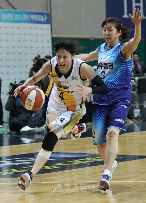 28일 오후 경기도 안산 단원구 와동체육관에서 열린 여자프로농구 챔피언 결정전 1차전 신한은행과 KDB생명의 경기에서 신한은행 최윤아가 KDB생명 김진영의 마크를 피해 돌파하고 있다.