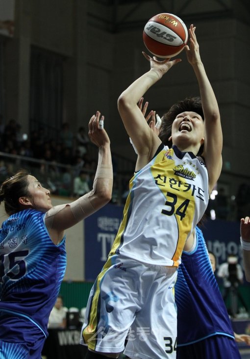 신한은행 하은주(34번)가 28일 안산 와동체육관에서 열린 여자프로농구 챔피언 결정 1차전에서 KDB생명의 수비를 피해 골밑슛을 쏘고 있다.