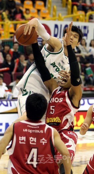 동부 김주성(맨위)이 29일 창원 실내체육관에서 열린 LG와의 프로농구 6강 플레이오프 3차전에서 LG 문태영(아래 15번)과 볼을 다투고 있다.