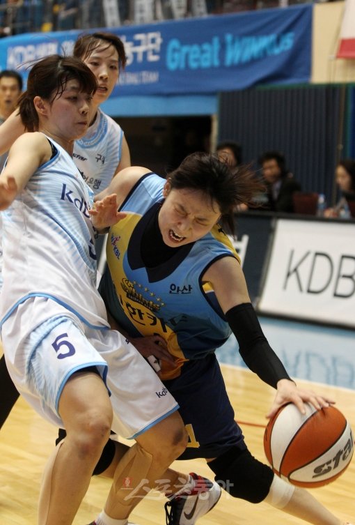 30일 오후 경기도 구리실내체육관에서 열린 여자프로농구 챔피언 결정전 2차전 신한은행과 KDB생명의 경기에서 신한은행 최윤아가 KDB생명 이경은의 마크를 뚫고 드리블을 하다 공을 놓치고 있다.