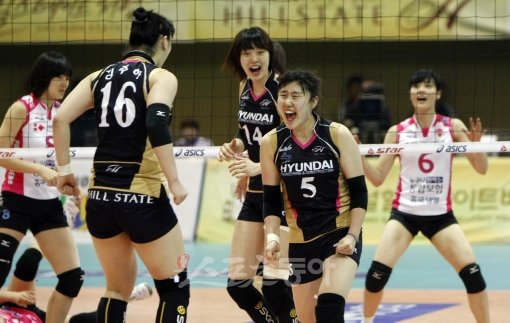 30일 수원실내체육관에서 열린 NH농협 2010∼2011 V리그 챔피언결정전 1차전에서 현대건설의 염혜선(5번)이 블로킹 득점에 성공한 뒤 환호하고 있다.
