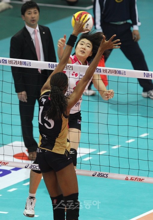 31일 수원실내체육관에서 열린 ‘NH농협 2010-2011 V리그’ 챔피언결정전 현대건설 대 흥국생명 2차전 경기에서 흥국생명 전민정이 현대건설 케니의 블로킹에 맞서 공격하고 있다.