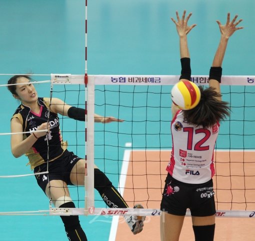31일 수원실내체육관에서 열린 ‘NH농협 2010-2011 V리그’ 챔피언결정전 현대건설 대 흥국생명 2차전 경기에서 현대건설 황연주가 흥국생명 한송이의 블로킹 사이로 공격하고 있다.