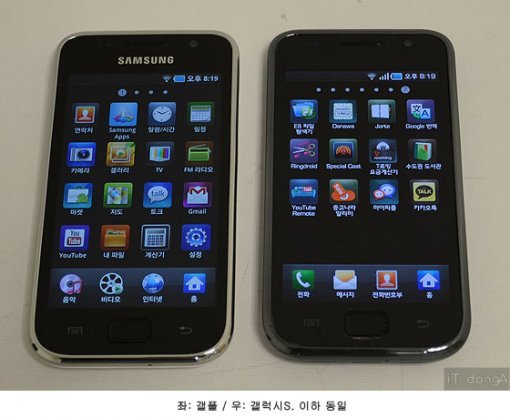 참고로 화면 크기는 동일하나 상단 전화 수신부와 하단 홈 버튼의 위치가 약간 달라, 갤럭시S용 화면 보호 필름을 부착하긴 어렵다.