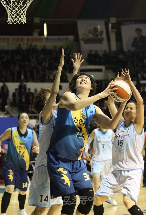 1일 오후 서울 장충체육관에서 열린 여자프로농구 챔피언 결정전 3차전 신한은행과 KDB생명의 경기에서 신한은행 하은주가 상대수비수를 피해 슛을 노리고 있다.