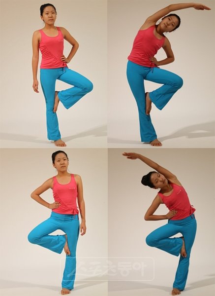 3. 서서 오른무릎을 접어 오른발을 왼쪽 무릎에 대고 오른손은 허리에 올린다.