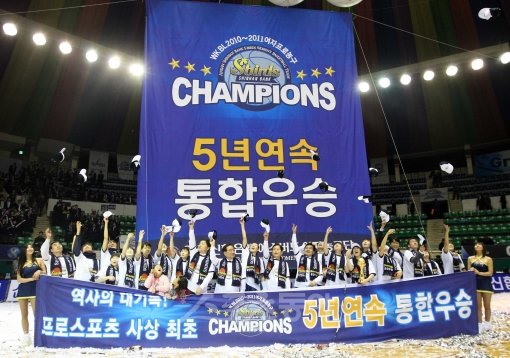 정규리그 우승팀 신한은행은 1일 서울 장충체육관에서 열린 삼성생명 2010∼2011 여자프로농구 챔피언 결정 3차전에서 정규리그 3위 구리 KDB생명을 67-55로 꺾고 3연승으로 왕좌에 올랐다. 2007년 겨울리그 정상을 차지한 이후 5시즌 연속 정규리그·챔피언결정전 통합 우승. 여자프로농구 사상 최초의 금자탑이다. 전신 현대 시절을 포함하면 통산 일곱 번째 우승이기도 하다. 리그 최장신(2m3) 센터 하은주는 기자단 투표에서 총 53표 중 35표를 얻어 챔프전 최우수선수(MVP)로 뽑혔다.