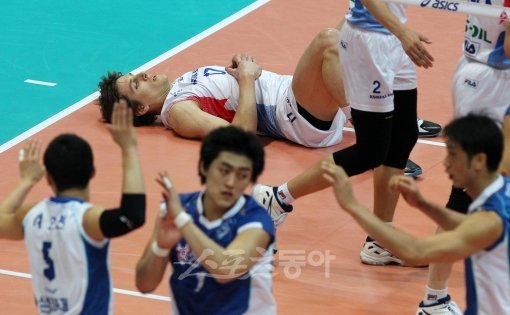3일 오후 경기 인천도원시립체육관에서 열린 프로배구 대한항공과 삼성화재의 챔피언결정전 1차전 경기에서 대한항공 에반이 공격 포인트를 내준 뒤 누워 있다.