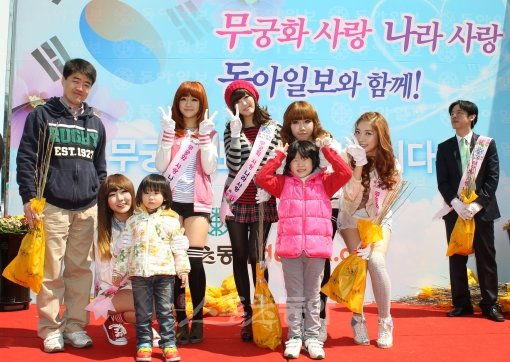 식목일인 5일 오후 서울 종로구 세종로 동아미디어센터 앞 동아광장에서 열린 무궁화 묘목 무료 배부행사에서 신예그룹 달샤벳이 시민들과 기념촬영을 하고 있다.