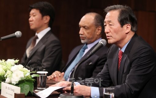 정몽준 대한축구협회 명예회장이 5일 오후 서울 중구 장충동 신라호텔 영빈관 루비룸에서 열린 기자회견에서 인사말을 하고 있다.