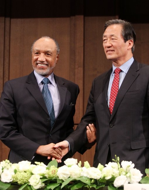 5일 오후 서울 중구 장충동 신라호텔 영빈관 루비룸에서 모하메드 빈 함맘 아시아축구연맹(AFC) 회장과 정몽준 대한축구협회 명예회장이 악수를 하며 포즈를 취하고 있다.