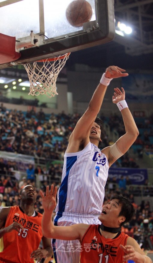 5일 오후 인천 삼산실내체육관에서 열린 2010-11 현대모비스 프로농구 4강 플레이오프 인천 전자랜드와 전주 KCC의 경기에서 KCC 하승진이 리바운드볼을 따내기 위해 안간힘을 쓰고 있다.