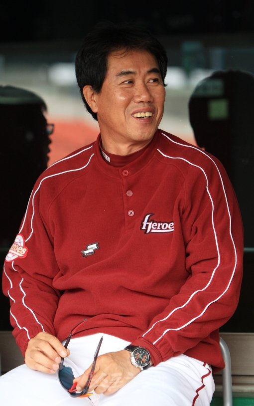 6일 서울 목동야구장에서 열린 ‘2011 롯데카드 프로야구’ 넥센과 두산의 경기에 앞서 넥센 김시진 감독이 취재진과 담소를 나누며 미소짓고 있다.