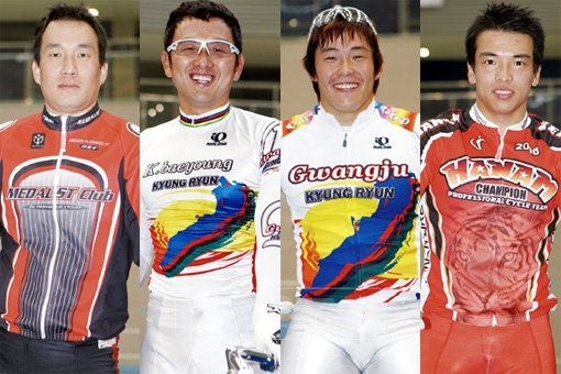 3월16∼18일 일본 고치현에서 열릴 예정이었던 한일 경륜대항전이 대지진 여파로 무산된 가운데 한국대표팀은 일본선수들과 치른 시범경주에서 2-2의 아쉬운 무승부를 기록했던 것으로 알려졌다. (왼쪽부터) 한국대표팀의 김영섭, 김배영, 노태경, 이욱동.