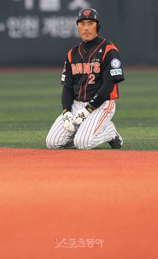 10일 서울 목동야구장에서 열린 ‘2011 롯데카드 프로야구’ 넥센과 롯데의 경기에서 5회초 2사 1, 2루 상황에 넥센 선발 김영민이 마정길로 교체되자 2루 주자 조성환이 잠시 그라운드에 무릎을 꿇고 휴식을 취하고 있다.