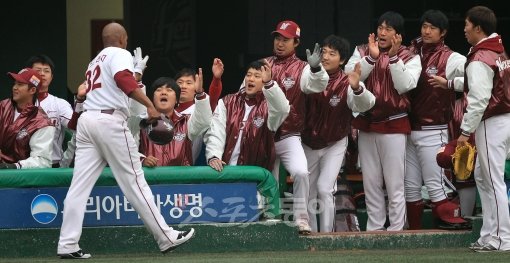 10일 서울 목동야구장에서 열린 ‘2011 롯데카드 프로야구’ 넥센과 롯데의 경기에서 4회말 2사 상황에 알드리지가 솔로홈런을 때려내고 덕아웃에 들어와 동료들과 기쁨을 나누고 있다.