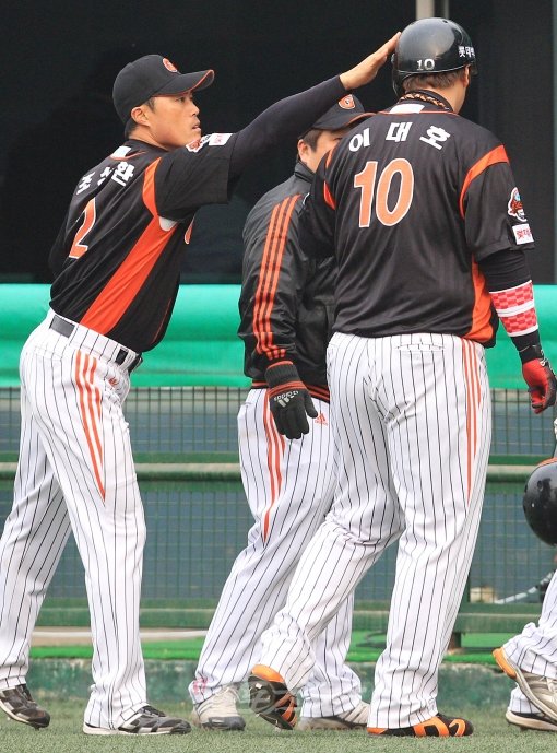 10일 서울 목동야구장에서 열린 ‘2011 롯데카드 프로야구’ 넥센과 롯데의 경기에서 1사 2루 상황에 강민호의 홈런으로 홈을 밟은 2루주자 이대호가 덕아웃에 들어와 동료들의 조성환의 축하를 받고 있다.