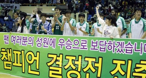 동부가 정규리그 우승팀 KT를 꺾고, 2007∼2008시즌 이후 처음 챔피언결정전에 진출했다. 홈팬들의 성원에 답하는 동부 선수들의 모습. 한 때 ‘치악산 호랑이’로 불리던 KT 전창진 감독은 친정팀에 무너지며 2년 연속 4강 PO에서 분루를 삼켰다.