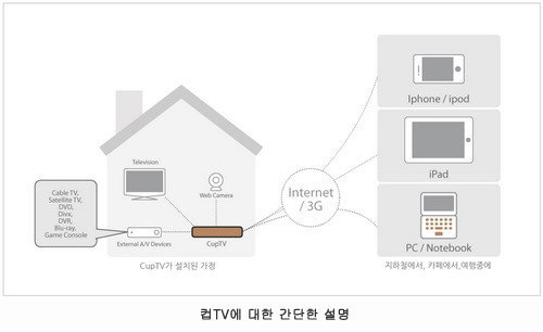 [보도자료] 케이블, 위성, IPTV와 같은 다양한 TV 서비스나, DVD나 블루레이 플레이어와도 연결이 가능한 ‘CupTV’는, 3G 데이터 통신 또는 유/무선 Wi-Fi가 가능한 곳이라면 가정에 연결된 홈씨어터 미디어 영상을 실시간으로 PC나 아이폰, 아이패드를 통해 전송하여 준다. …중략… 또한 ‘CupTV’ 전용 웹캠을 연결할 경우 홈뷰 기능을 통한 보안 CCTV나 베이비 모니터링으로도 활용할 수 있다.