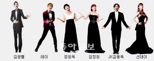 A: JK김동욱은 목소리도 독특해 잘할 줄 알았는데 의외로 목에서 소리를 잡더라. 그냥 말할 때는 두꺼우면서 웅장한 소리가 나는데, 노래를 하면 그 두께가 얇아진다. 성대에서 소리를 내지 말고 두성(頭聲)을 사용해 폭발력을 키웠으면 좋겠다(서희태). 선데이는 발랄하고 탄력 있는 목소리를 기대했는데, 아무래도 뮤지컬과 병행하다 보니 목소리에 피로도가 짙더라. 허스키한 면도 나오고…. 그러나 열심히 한 만큼 지금까지는 가장 많은 성과를 낸 사람이 아닌가 싶다(서정학).
