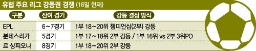 팀 당 38라운드씩 소화하는 프리미어리그. 31∼32게임씩 치렀으니 6∼7경기 정도 남긴 상황이다.