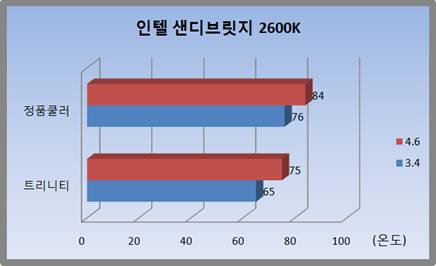 CPU가 내뿜고 있는 열을 트리니티가 얼마나 낮춰주는가를 테스트하기 위해, 인텔의 최신형 CPU인 코어 i7-2세대 2600K(샌디브릿지)를 이용해 CPU 최대 이용 시 평균 온도를 측정했다. 아무래도 이러한 쿨러가 필요한 사용자는 오버클러킹을 염두에 둘 테니, 이들을 위해 샌디브릿지의 기본 클럭인 3.4GHz, 그리고 오버클러킹 한 클럭인 4.6GHz 환경에서 각각 테스트했다.