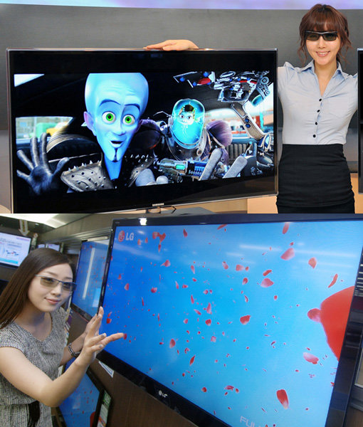 삼성전자와 LG전자가 3D TV 기술 논쟁에 이어 보급형 제품을 잇달아 출시하며 가격 경쟁을 벌이고 있다. 삼성전자 3D TV D6000 시리즈(위)와 LG전자의 LW4500.