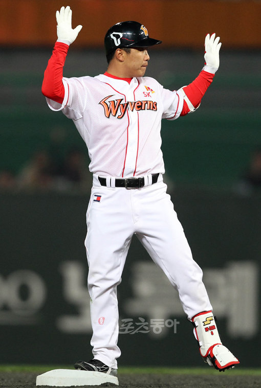 19일 인천 문학야구장에서 열린‘2011 롯데카드 프로야구’SK와이번즈와 LG트윈스의 경기에서 5회말 1사 2루에서 SK 정근우가 동점 1타점 좌전 적시타를 날린 후 2루에서 환호하고 있다.