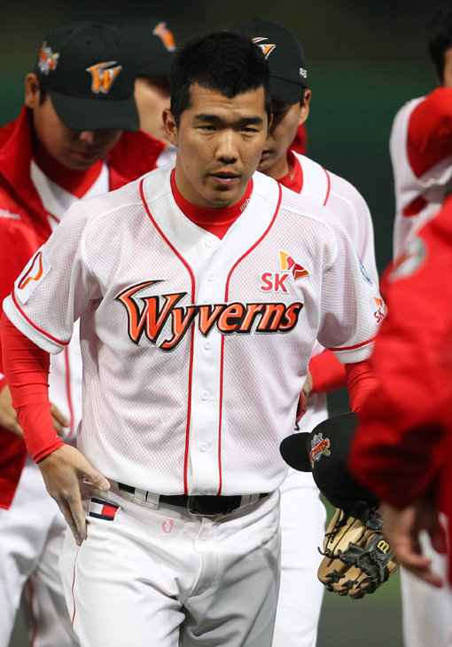 19일 인천 문학야구장에서 열린 ‘2011 롯데카드 프로야구’ SK와이번즈와 LG트윈스의 경기에서 6대 3으로 승리한 SK 정근우가 동료들과 하이파이브를 하고 있다.