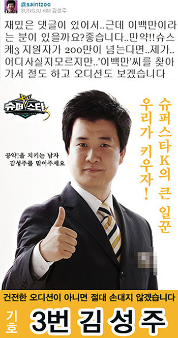 김성주는 18일 오후 자신의 트위터를 통해 “슈퍼스타K3 지원자수가 200만 명을 넘긴다면, 이백만이라는 이름을 가진 분 앞에서 절도 하고 오디션을 보겠다”고 선언했다.