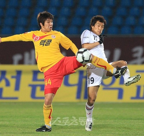 20일 오후 8시 탄천종합운동장에서 열린 ‘현대오일뱅크 K리그 2011’ 성남일화와 대전시티즌의 경기에서 성남 홍진섭과 대전 전상훈이 볼을 다투고 있다.