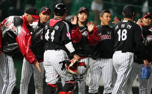 20일 인천 문학야구장에서‘2011 롯데카드 프로야구’LG트윈스와 SK와이번즈의 경기가 열렸다. 9대 4로 승리한 LG 선수들이 경기 종료 후 기쁨을 나누고 있다.