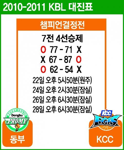 결국 1쿼터부터 리드를 잡은 동부는 62-54로 승리했다. KCC가 기록한 54점은 역대 챔피언결정전 한 경기 최저득점이다. 동부 강동희 감독은 “윤호영이 (발목과 무릎이 안 좋아) 훈련도 제대로 못했는데 잘 해줬다.”고 칭찬했다.