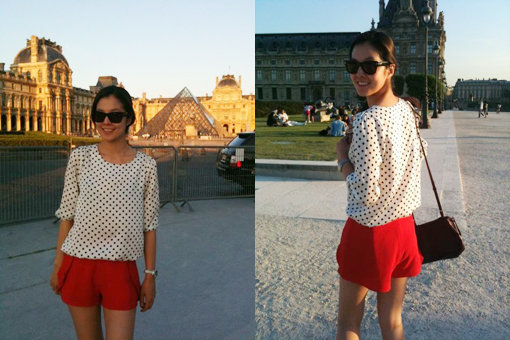 사진 속 김성은은 파리의 루브르 박물관 앞에서 선글라스를 끼고 도트무늬 블라우스와 빨간색 핫팬츠를 입고 있다.
