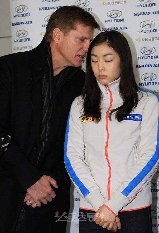 오피가드 코치가 출국에 앞서 인터뷰를 하다 김연아에게 귀엣말을 전하고 있다.