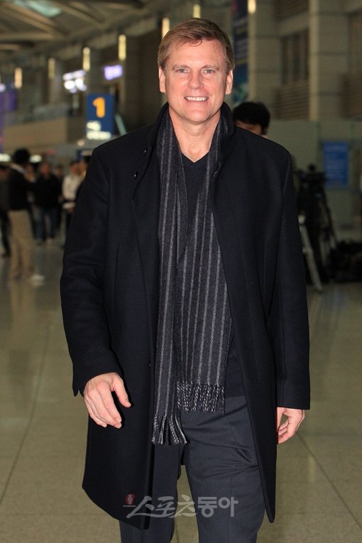 오피가드 코치가 미리 출국장에 와 취재진의 카메라를 바라보고 있다.