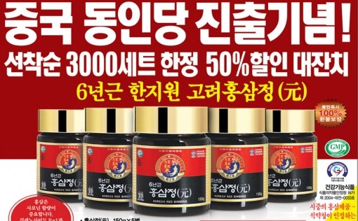헬스팜에서는 한지원 고려홍삼의 중국 동인당 진출기념으로 6년근 한지원 고려홍삼정(元) 고농축원액 150그램(g) 세 병을 5만9800원, 열 병 14만 8000원에 3000세트 한정판매하고 있다. (문의 1588-5385)