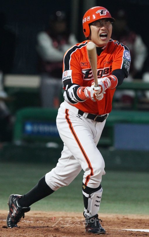 27일 서울 목동야구장에서 열린 '2011 롯데카드 프로야구' 한화 이글스와 넥센 히어로즈의 경기에서 3회초 한화 공격, 1사 1루 한화 장성호가 플라이 아웃되자 아쉬워하고 있다.