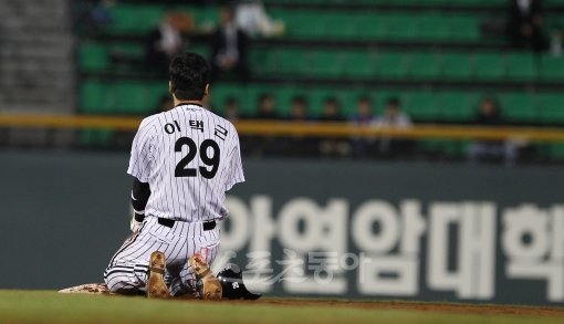 29일 서울 잠실야구장에서 열린 '2011 롯데카드 프로야구' 넥센 히어로즈와 LG 트윈스의 경기에서 3회말 LG 공격, 2사 2루 주자 이택근이 박용택의 타석 때 2루 도루에 실패하고 있다.