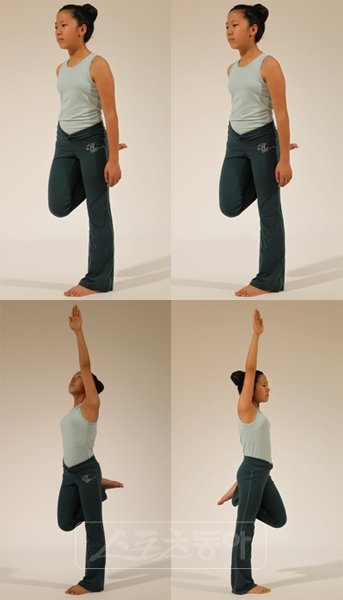 ※ 주의: 2,4번 자세에서 팔을 높게 들면서 외다리서기는 매우 힘든 자세이므로, 한쪽 발목을 잡고 고개만 뒤로 젖혀도 무방하다.