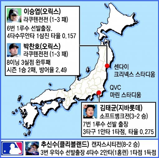 김태균 (지바롯데) 소프트뱅크전 (3-2승) 7번 1루수 선발 출장 3타구 1안타 1타점, 타율 0.275