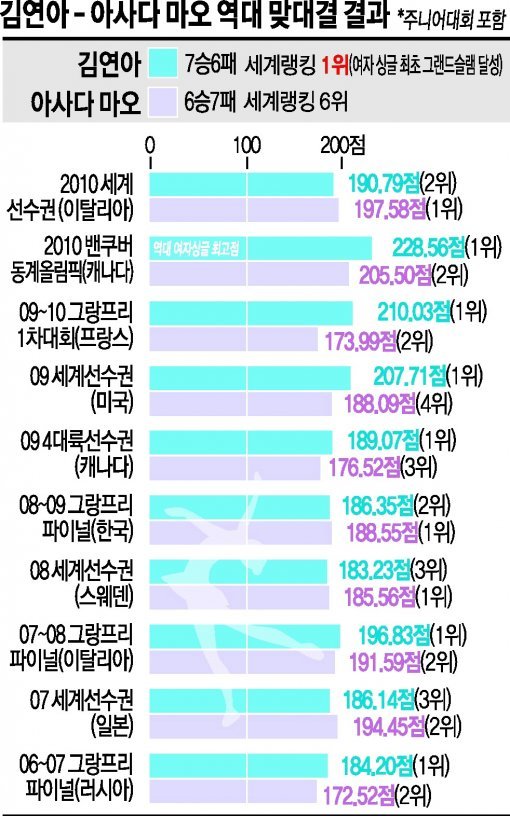 이후 김연아는 아사다가 아니라 그녀 자신이 라이벌이었다. 김연아는 2010년 2번의 그랑프리 시리즈와 그랑프리 파이널에서 우승을 차지했고 ‘꿈의 무대’ 밴쿠버 동계올림픽에서도 금메달을 목에 걸며 진정한 ‘피겨퀸’의 자리에 올랐다. 아사다가 올림픽 직후 열린 세계선수권대회에서 정상을 탈환했지만 올림픽 금메달로 이미 최고의 자리에 올라 목표를 상실한 김연아가 부진했기에 가능했던 일이다.