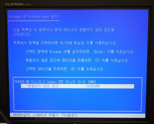 테스트 PC에 윈도우 XP 디스크를 삽입한 뒤 설치를 시작했다. 설치 과정 초반의 디스크 파티션 선택 메뉴에서 인식한 하드디스크는 총 764429MB(약 750GB)였다. 총 3TB 중에 1/4 정도만 인식된 것. 하지만 일단은 계속 설치를 진행해 보았다. 용량의 일부만 인식되었지만 윈도우 XP이 설치 자체는 정상적으로 진행이 가능했다.