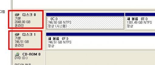 다만, 3TB 전체가 하나의 디스크로 인식되지는 않고 2,048GB와 746.5GB의 2개의 디스크로 나뉘어 있는 것으로 표시되어 있다. 3TB 전체를 약 2.2TB와 약 0.8TB로 나뉘어서 사용하는 것인데, 하나의 드라이브로 잡지 못하는 것은 다소 아쉽지만 그래도 아예 사용하지 못하는 것보다는 훨씬 낫다. 그리고 어차피 3TB를 하나의 드라이브로 사용하는 것 보다는 2~3개로 나누어 사용하는 것이 보다 관리 측면에서 효율적이기도 하다. 만약 3TB를 하나의 드라이브로 사용하고 싶다면 UEFI 바이오스를 지원하는 메인보드에 64비트 운영체제를 탑재한 PC의 구매를 생각해 보는 것이 좋겠다.
