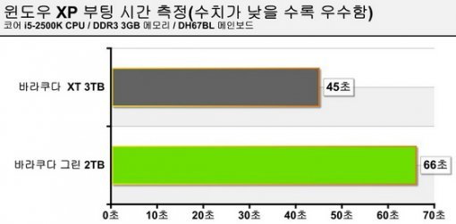 측정 결과, 회전속도가 낮은 바라쿠다 XT가 20초 가량 더 빨리 부팅을 마칠 수 있었다. 역시 버퍼 메모리의 용량과 인터페이스가 같아도 디스크의 회전속도 차이는 극복할 수 없는 것으로 보인다.