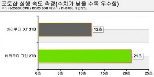 측정 결과, 바라쿠다 XT 3TB가 보급형 하드디스크보다 2배 가까이 빠른 것으로 나타났다. 포토샵 같은 프로그램은 실행과 동시에 여러 파일을 읽거나 쓰는 과정이 반복되므로 속도가 느린 하드디스크에서는 실행 시간이 훨씬 길어진다.