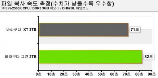 여전히 바라쿠다 XT 3TB가 더 빠르긴 하지만 이전 테스트에 비해서는 차이가 크지 않다. 고속의 하드디스크는 윈도우 부팅용이나 프로그램 설치용으로는 큰 효과를 볼 수 있지만, 단순히 파일을 복사해 넣고 보관하는 용도로는 가격대비 효율이 약간 떨어진다고 볼 수 있다.