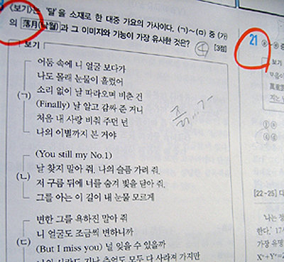 가수 보아의 히트곡인 ‘넘버원’이 EBS 언어영역 시험 문제로 출제돼 화제다. 보아는 3일 자신의 트위터(@BoA_1105)를 통해 이런 사실을 공개하며 “haha nice!”라는 문구와 함께 한 트위터리안의 글을 리트윗했다. 보아가 리트윗한 글에는 “넘버원이 대중가요로는 처음으로 EBS 언어영역 지문에 출제됐다”는 내용과 함께 시험지를 찍은 사진이 게재돼 있다. 언어영역 시험지에는 ‘넘버원’의 가사를 지문으로 제시하고 ‘낙월’의 이미지와 기능이 유사한 것을 꼽으라는 질문이 담겨 있다. 누리꾼들은 “보아가 자랑할 만 하다”는 의견부터 “지금 고등학생들이 ‘넘버원’을 과연 알고 있을까”라는 궁금증까지 다양한 반응을 쏟아내고 있다.