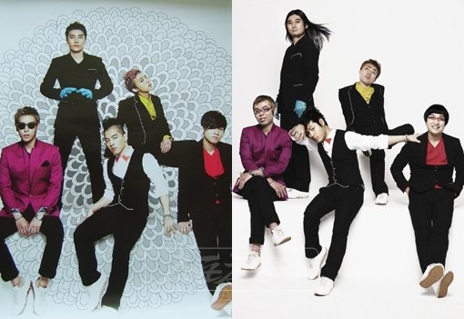 인기 아이돌 그룹 빅뱅(왼쪽) 스타일을 머리부터 발끝까지 패러디한 일본 인기개그맨 출신의 ‘픽뱅’이 화제다.