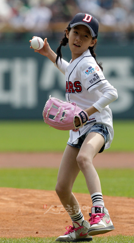 5일 서울 잠실야구장에서 열린 ‘2011 롯데카드 프로야구’ 두산과 LG의 경기에 앞서 어린이날을 맞이해 아역배우 김새론이 시구하고 있다.